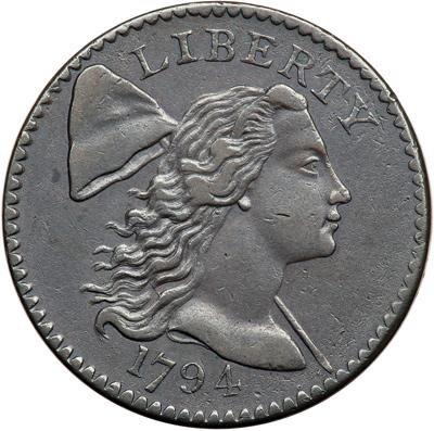 1794 S-54 R3. VF-35. Frosty chocolate and steel with a small patch of medium brown toning at the top of OF. The only mark is a tiny horizontal nick on the cheek left of the mouth. Satiny luster remains visible in protected areas, especially on the reverse. A nicely balanced strike offering excellent eye appeal. E-MDS, Breen state II, showing delicate die clashmarks on the reverse but none on the obverse. Called VF35 and tied for CC#5 in the Bland census. Noyes also says VF35 but tied for CC#4, his photo #28282. Removed from a PCGS slab graded AU53 (PCGS label included, and it shows the attribution and Husak provenance). PCGS Population 1; The only one graded at PCGS for the variety. DWH #3474.