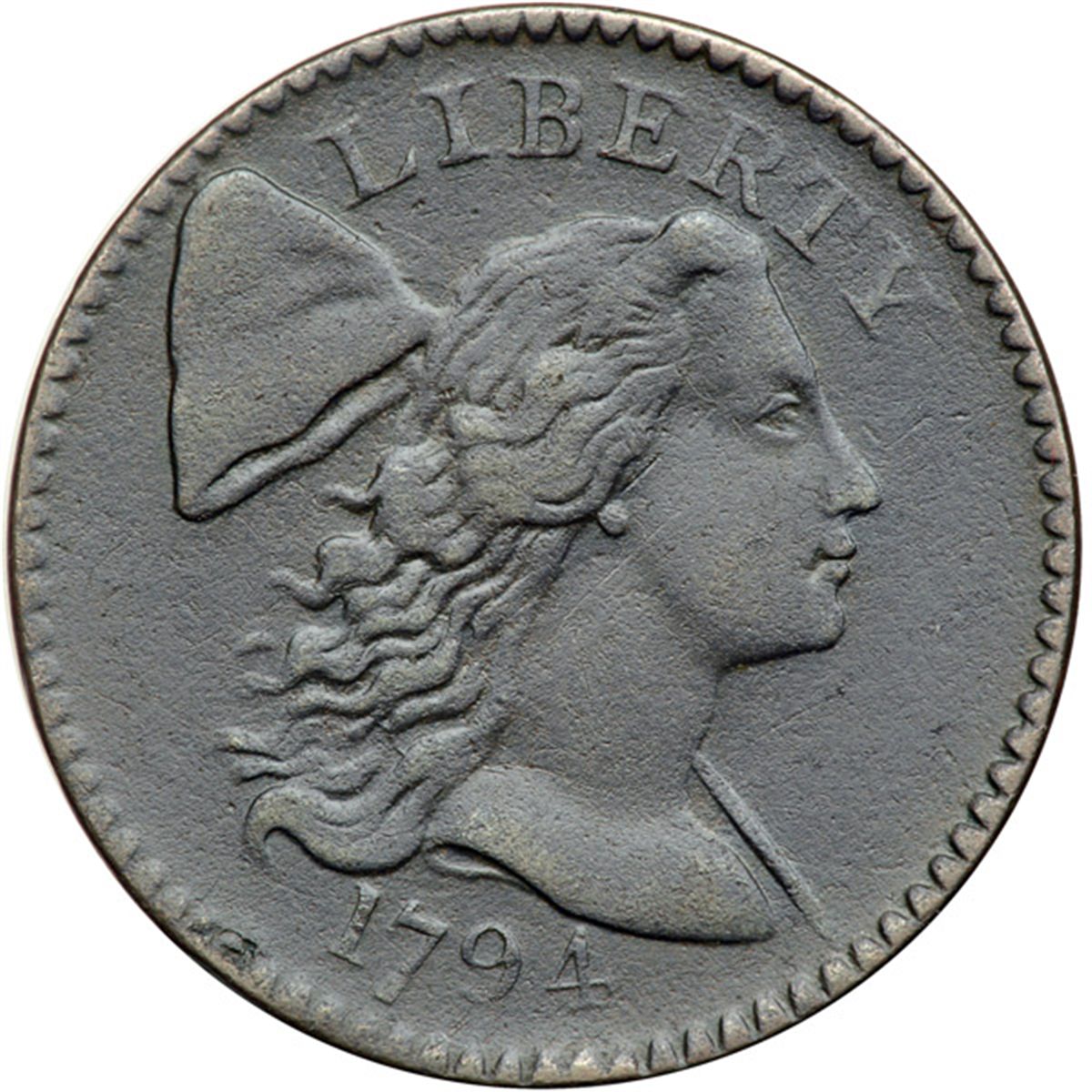 1794 S-55 R2 VF25. Ten points sharper but the surfaces are a bit dull thanks to uniform extremely faint granularity that covers the planchet. No verdigris, and the only sign of contact is a rim dent over ES in STATES. Frosty dark chocolate brown and steel. EDS. The date and legends are all strong.