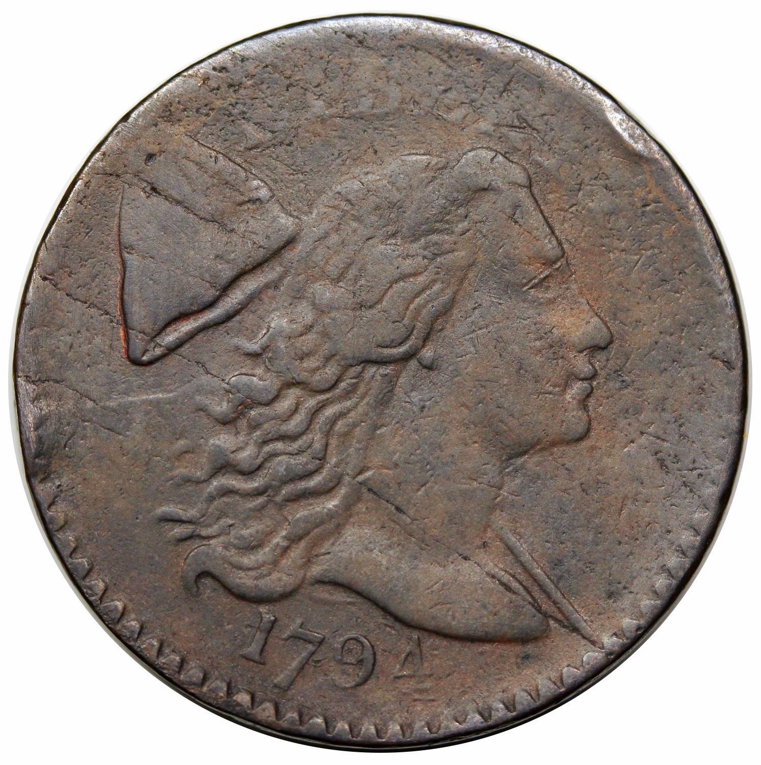 Head of 1794. A decent Office Boy with slightly glossy steel and olive brown surfaces and orangey-tan undertones. Close to VF by sharpness but has a few rim bumps that were filed down. Only minor marks otherwise and some as-made planchet striations across the obverse. Axially misaligned dies caused a weak strike at the lower obverse and upper reverse as seen on many of the variety. Bold edge lettering.
