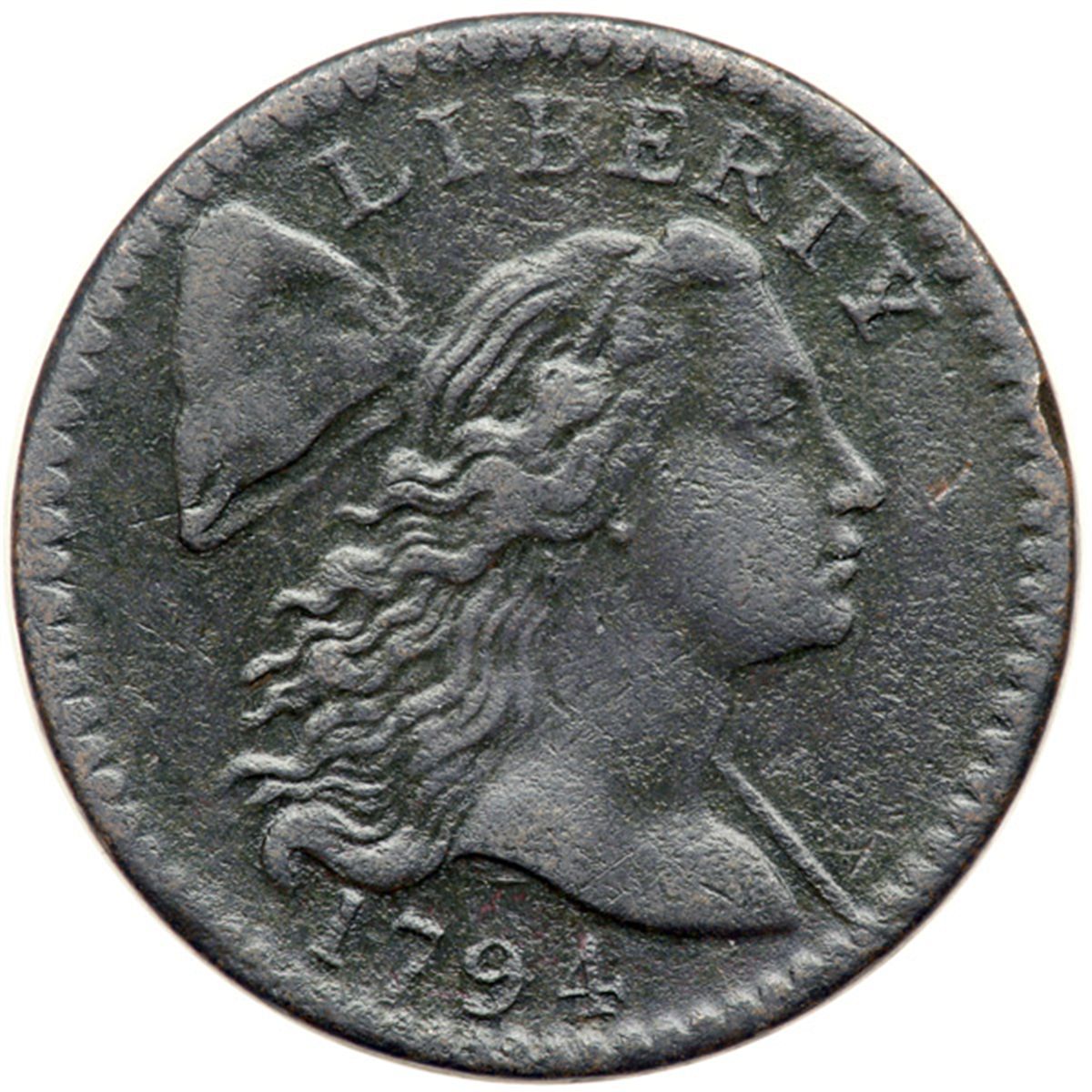 1794 S-59 R3 F15. Sharpness VF35 but dark with very fine roughness under the glossy dark olive and steel patina. The roughness is very light on the obverse, stronger on the reverse, especially at UNIT and the fraction, but there is no verdigris. A dull nick on the cap under the L in LIBERTY is the only notable mark. The date is strong and the legends are clear except for weakness at the fraction and UN.
