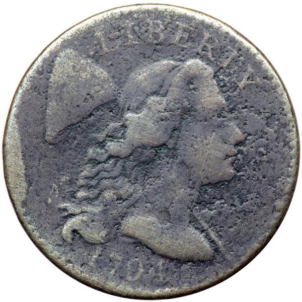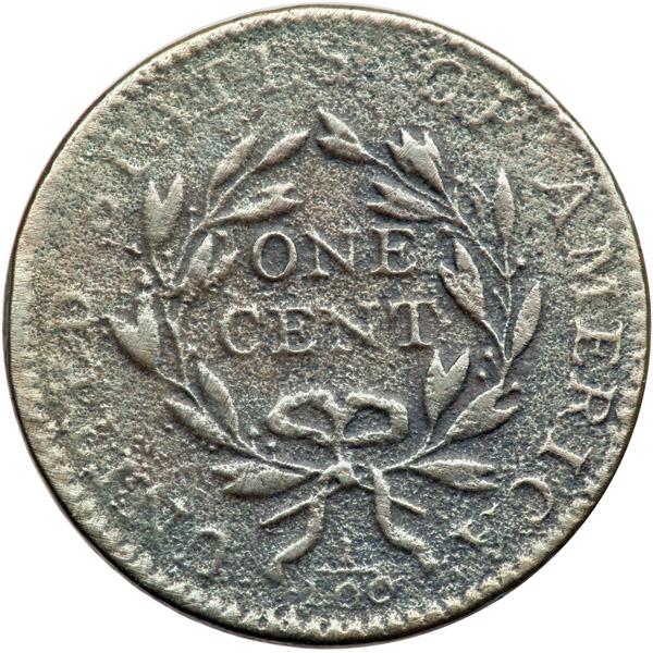 1794 S-62 R4+ G5. Sharpness VG10, perhaps even better on the reverse, but this cent is moderately corroded. No notable verdigris but there are very faint hairline scratches covering both sides. The obverse is dark olive with lighter steel brown toning on the devices. The reverse was cleaned and has retoned a lighter shade of golden steel and olive. Not the most attractive cent in this sale, but the date and legends are easily readable. LDS, Breen state II, with a strong cud break at the rim behind the portrait.