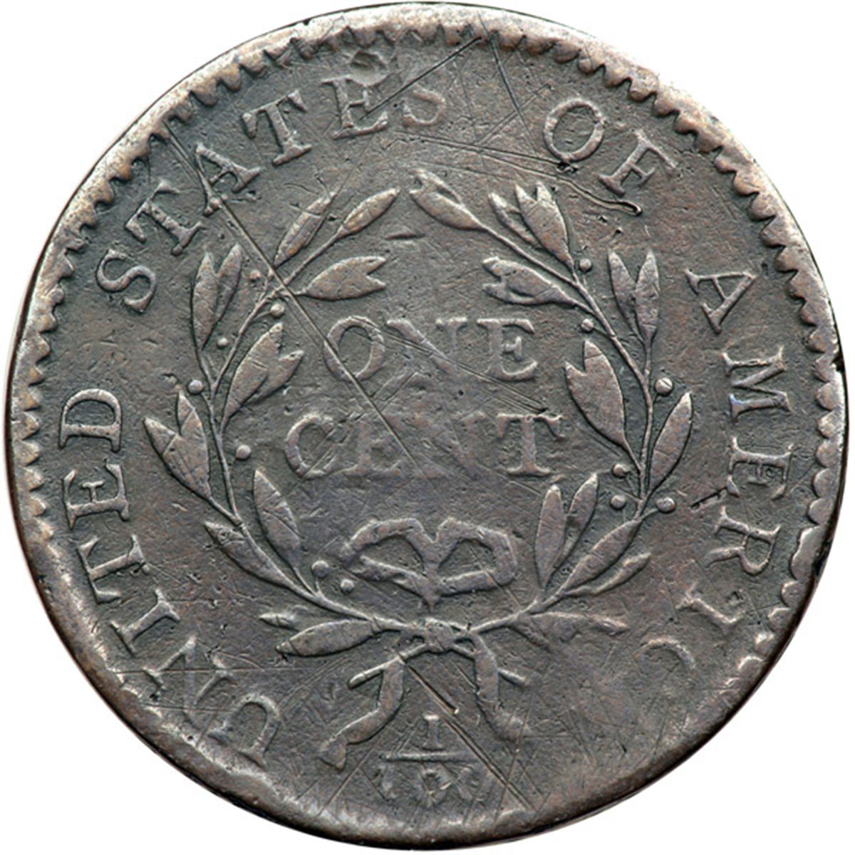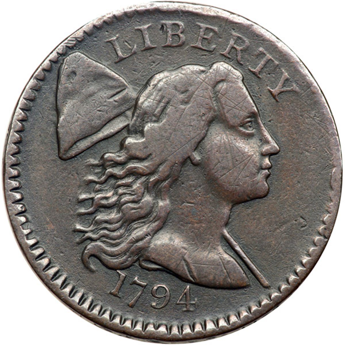 1794 S-65 R1 F12. Slightly sharper but there are fine pinscratches on the reverse, the notable ones from the A in STATES to the E in CENT and a couple more from under the second S in STATES to below OF. The obverse is nice for the grade, the only mark being a diagonal nick on the bust above the 4. Glossy chocolate brown, darker in the protected areas and lighter on the devices. MDS, Breen state IV, with the usual die crack at ES in STATES and swelling at CA in AMERICA. The date is bold and the legends are clear except for strike weakness at CA.