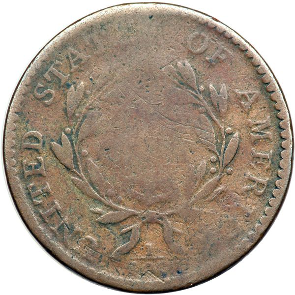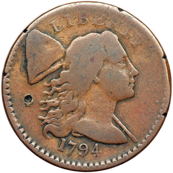 1794 S-65 R1 G4. A couple points sharper, especially on the obverse, but there is a punchmark in the field under the cap and a few rim nicks on the obverse. Otherwise the surfaces are smooth and the color is a very attractive glossy light chocolate brown with olive toning in protected areas. The date is bold. LDS with swelling and die cracks on the reverse.