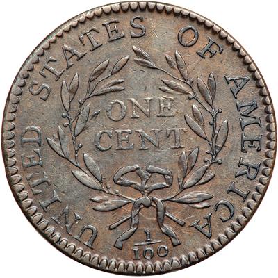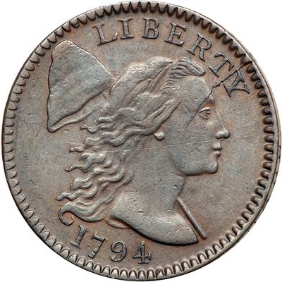 1794 S-70 R2. VF-30. Sharpness EF45 but there are a half dozen light pinscratches on the obverse and one more on the reverse. These scratches are old and do not alter the toning. Otherwise the surfaces are quite nice, nearly flawless. Frosty steel and chocolate with satiny mint luster showing in protected areas, especially on the reverse. Sharply struck LDS, Breen state IV. The die crack down from the rim at TY is strong and reaches the jawline, and the die clashmarks on the reverse are clear (including the impression of Ms Liberty's nose under ER in AMERICA). A sharp, attractive example in spite of the faint scratches.