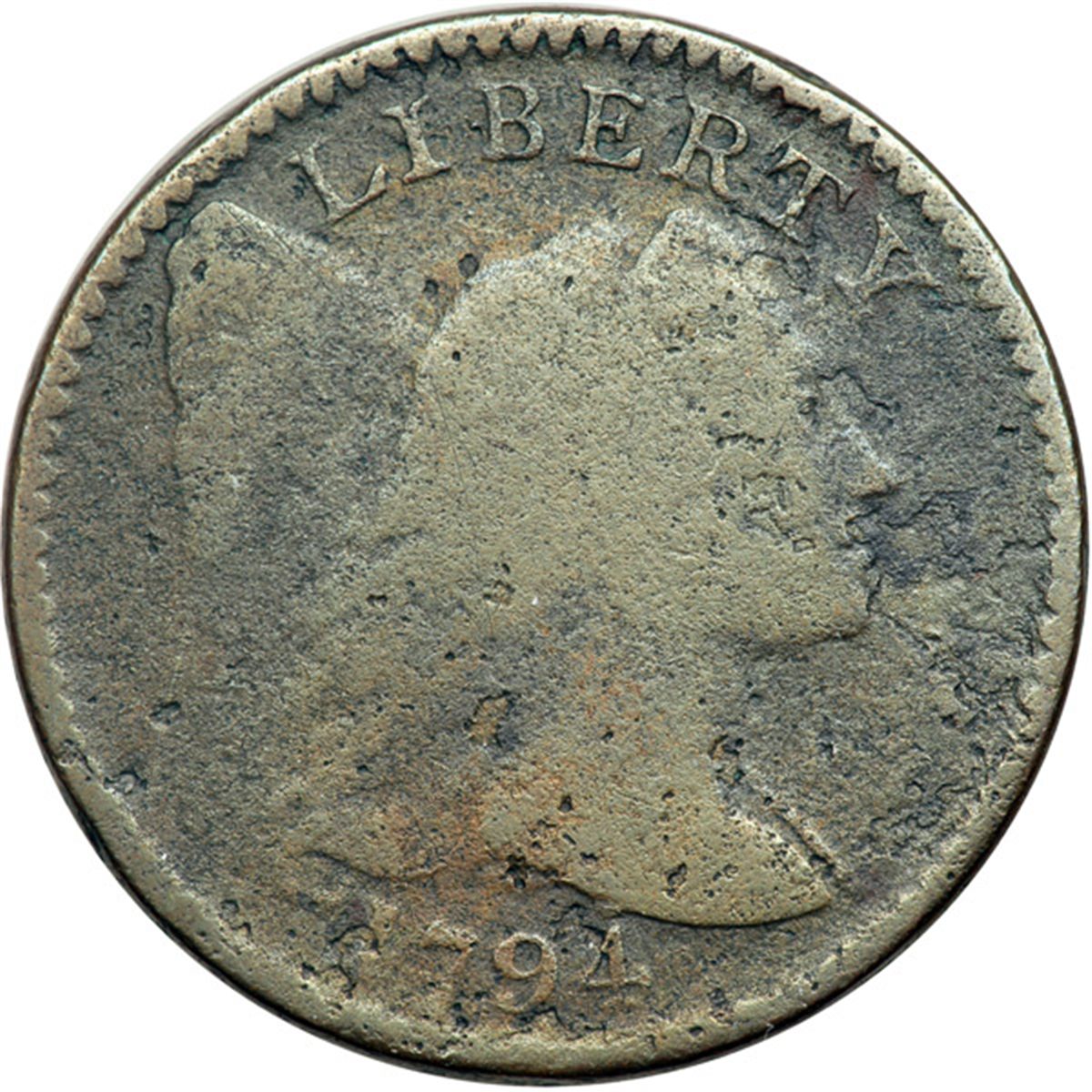 1794 S-71 R2 G4. Head of 1795. A couple points sharper but dull and covered with fine porosity, strongest on the face into the field at right. Lightly cleaned and retoned slightly glossy bluish steel and light chocolate with lighter brown toning on highpoints of the reverse. The date and legends are complete except for weakness at ONE CENT due to die sinking in the center of the reverse.