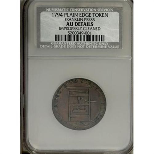 <B>1794 TOKEN Franklin Press Token--Improperly Cleaned--NCS. AU Details.</B></I> NGC Census: (0/0). PCGS Population (18/129). (#630)<BR><BR><b>Shipping:</b> Coins & Currency (<a target="_blank" href="http://www.heritageauctions.com/common/shipping.php">view shipping information</a>)