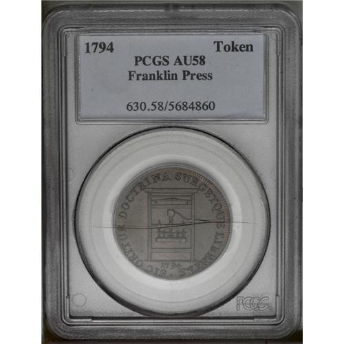 <B>1794 TOKEN Franklin Press Token AU58 PCGS.</B></I> Breen-1165. A charming chocolate-brown piece with minimal marks and a glossy appearance. An early die state: no breaks are present within the press, but a large chip and bulging (as made) are seen at 5 o'clock. Listed on page 72 of the 2006 <I>Guide Book.</B></I>