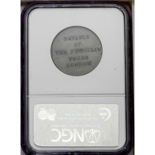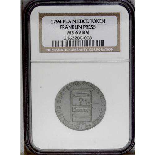 <B>1794<TOKEN> Franklin Press Token MS62 Brown NGC.</B></I> Breen-1165. This glossy American-themed Conder token possesses deep blue-green semi-prooflike fields. The die break within the press is well advanced. Tiny planchet flaws congregate on the RA in FRANKLIN. Listed on page 72 of the 2007 <I>Guide Book.</B></I>