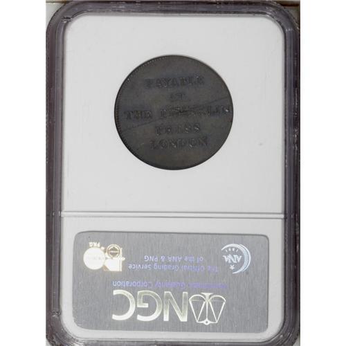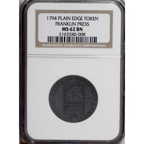 <B>1794 TOKEN Franklin Press Token MS62 Brown NGC.</B></I> Breen-1165. This glossy American-themed Conder token possesses deep blue-green semi-prooflike fields. The die break within the press is well advanced. Tiny planchet flaws appear at the RA in FRANKLIN. Listed on page 72 of the 2007 <I>Guide Book.</B></I><BR><BR><b>Shipping:</b> Coin/Currency (<a target="_blank" href="http://www.heritageauctions.com/common/shipping.php">view shipping information</a>)