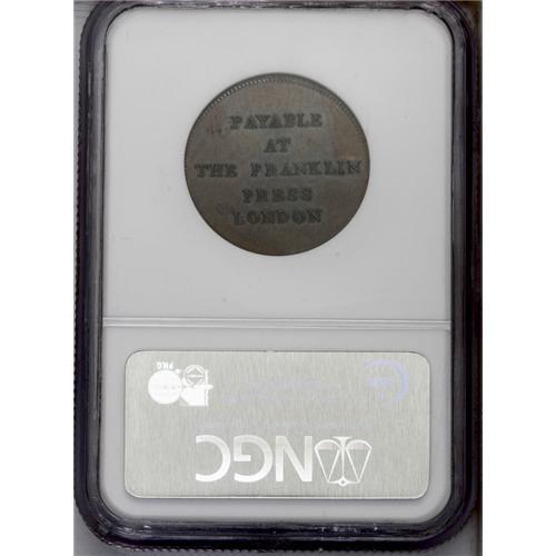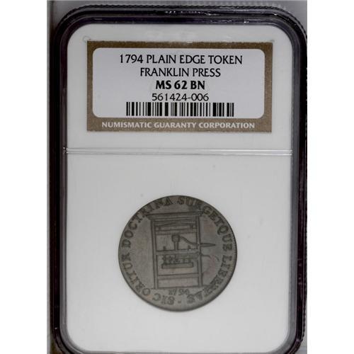 <B>1794<TOKEN> Franklin Press Token MS62 Brown NGC.</B></I> Plain Edge. Breen-1165. This boldly impressed representative is refreshingly smooth, although close inspection finds a couple of unimportant hairlines. The march of the familiar die break across the central press is in an intermediate state, present but relegated to the right side. Listed on page 72 of the 2007 <I>Guide Book.</B></I>