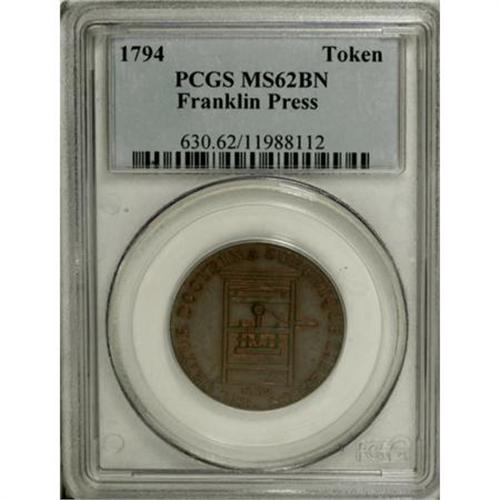 <B>1794 TOKEN Franklin Press Token MS62 Brown PCGS.</B></I> Breen-1165. An English tradesman's token, but collected in America because of its association with Benjamin Franklin. The milk-chocolate surfaces reveal generous amount of mint red around the devices on the obverse. The reverse is brown, with some light buildup in a few of the letters of the legend. There are no mentionable marks. Listed on page 72 of the 2008 <I>Guide Book.</B></I><BR><BR><b>Shipping:</b> Coins & Currency (<a target="_blank" href="http://www.heritageauctions.com/common/shipping.php">view shipping information</a>)