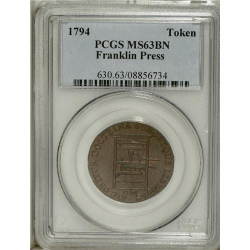 <B>1794 TOKEN Franklin Press Token MS63 Brown PCGS.</B></I> Breen-1165. This is the oft-seen die state with a large break inside the printing press. Lovely olive-brown surfaces retain considerable original red color. This British piece is collected as part of the colonial series due to its association with Benjamin Franklin who worked for the firm (under a different name) many years earlier. Listed on page 72 of the 2007 <I>Guide Book.</B></I> Population: 14 in 63, 7 finer (10/06).<BR><BR><b>Shipping:</b> Coin/Currency (<a target="_blank" href="http://www.heritageauctions.com/common/shipping.php">view shipping information</a>)