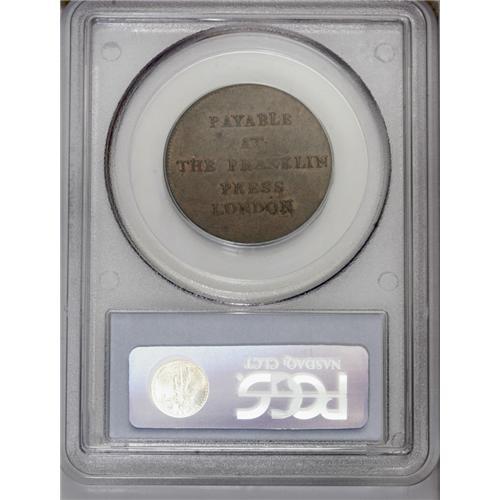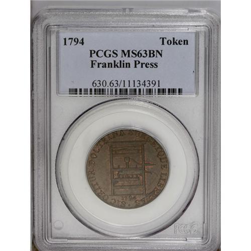 <B>1794<TOKEN> Franklin Press Token MS63 Brown PCGS.</B></I> Breen-1165. This is a wonderful example with lustrous olive-brown surfaces and considerable original mint color remaining on both sides. The Franklin Press pieces are among a limited number of colonial issues that can be found in Mint State grades with a modest effort. Listed on page 72 of the 2006 <I>Guide Book.</B></I><BR><I>From The Steve Glenn Collection, Part Two.</B></I>