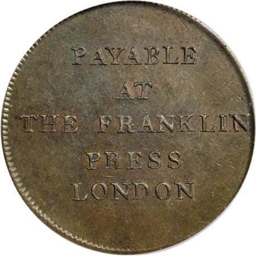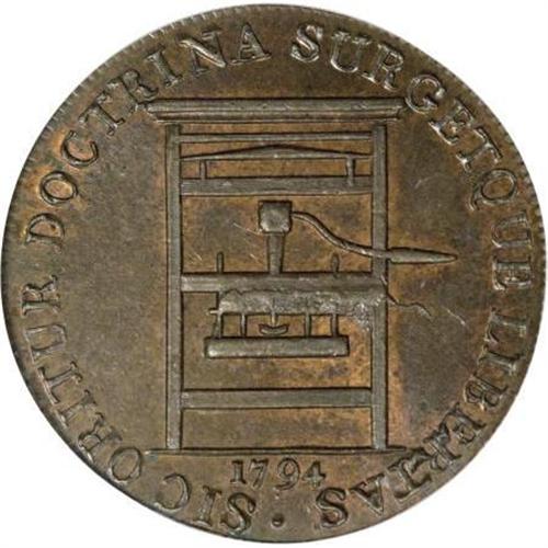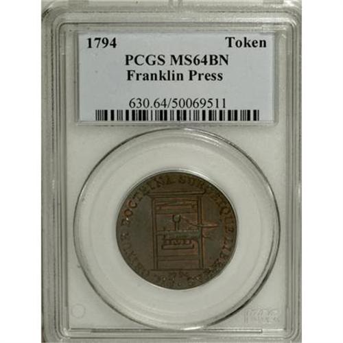 <B>1794 TOKEN Franklin Press Token MS64 Brown PCGS.</B></I> Although designated as Brown, glimpses of the initial orange-gold iridescence outline the letters and the press. The reverse has a pair of minor hair-thin marks. Listed on page 72 of the 2008 <I>Guide Book. </B></I>Population: 6 in 64 Brown, 1 finer (6/07).<BR><BR><b>Shipping:</b> Coins & Currency (<a target="_blank" href="http://www.heritageauctions.com/common/shipping.php">view shipping information</a>)