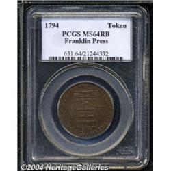 <B>1794<TOKEN> Franklin Press Token MS64 Red and Brown PCGS.</B></I> Breen-1165. An uncommonly well preserved example of this British token, each side shows mint red around the devices, although the obverse has significantly more than the reverse. An early die state as well with no trace of the die crack in the center. <BR><BR><B>Important notice:</B> Heritage usually auctions material at the rate of 200-250 lots per hour. On some occasions eBay Live bid software or the Internet may not be able to keep up with the pace of the auction. We recommend placing a realistic absentee bid now as insurance to avoid disappointment. Occasionally the auctioneer may eliminate or reject an eBay Live bid, and the auctioneer may also reopen a lot after the close of the eBay live bidding (usually because we missed an audience bid), and may reject your bid even if it shows you as the winning bidder. By bidding via eBay Live, you agree that Heritage may award the lot to another bidder at its sole discretion under the circumstances described above or any other reasonable circumstances. Since eBay bids are not shown to us until we open the lot on the floor, we treat those bids just like floor bids. In most cases the floor responds before the eBay bid is presented to us, due to Internet lag time, so for consistency we have made it a policy that floor bids are always considered first over tie eBay live bids. Also please note that all Heritage lots purchased through eBay Live carry a 20% Buyer's Premium. Please make sure you read the Terms and Conditions before you bid. </span></font></tr></table></td></tr></table>