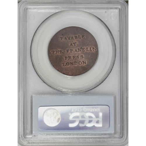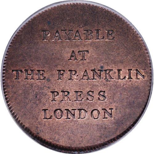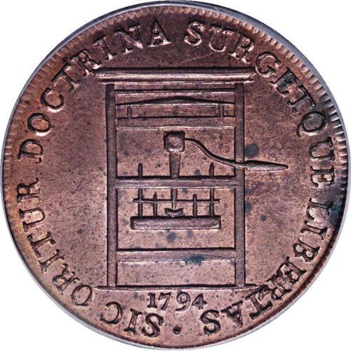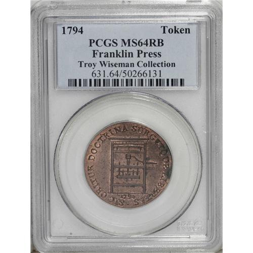 <B>1794 TOKEN Franklin Press Token MS64 Red and Brown PCGS.</B></I> Breen-1165. This variety is available in Uncirculated grades, but is nearly always encountered toned brown. The present near-Gem is a delightful exception, since glowing gold luster dominates the legends and partly illuminates the obverse field. From early dies without breaks on the press. Listed on page 72 of the 2007 <I>Guide Book.</B></I><BR><I>From The Troy Wiseman Collection, Part Two.</B></I><BR><BR><b>Shipping:</b> Coin/Currency (<a target="_blank" href="http://www.heritageauctions.com/common/shipping.php">view shipping information</a>)