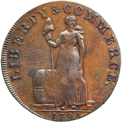 1794 Talbot Allum & Lee Cent with John Howard obverse Breen-1049. VF-35. Glossy medium brown and chocolate. Smooth and attractive. Close to EF40 but there is a small carbon spot at the left top of the cotton bale. Struck in medal turn, head-to-head. Weight 121.6 grains.