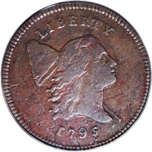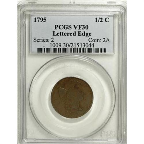 <B>1795 1/2 C Lettered Edge VF30 PCGS.</B></I> C-1, B-1, R.2. Quickly attributed by the letter I in the date instead of a 1 and the small die scratch after AMERICA. A glossy mahogany-brown example that displays balanced wear in spite of series of jagged planchet cracks on the obverse. Some old reddish corrosion is inconsequential. EAC 12.<BR><I>From The Beau Clerc Collection.</B></I><BR><BR><B>Coin Engraver:</B> John Smith Gardner<BR><BR><b>Shipping:</b> Coins & Currency (<a target="_blank" href="http://www.heritageauctions.com/common/shipping.php">view shipping information</a>)