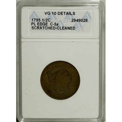 <B>1795 1/2 C Plain Edge--Cleaned, Scratched--ANACS. VG10 Details.</B></I> C-5a, B-5a, R.3. NGC Census: (3/95). PCGS Population (15/125). Mintage: 139,690. Numismedia Wsl. Price: $559. (#1018)<BR><BR><b>Shipping:</b> Coins & Currency (<a target="_blank" href="http://www.heritageauctions.com/common/shipping.php">view shipping information</a>)