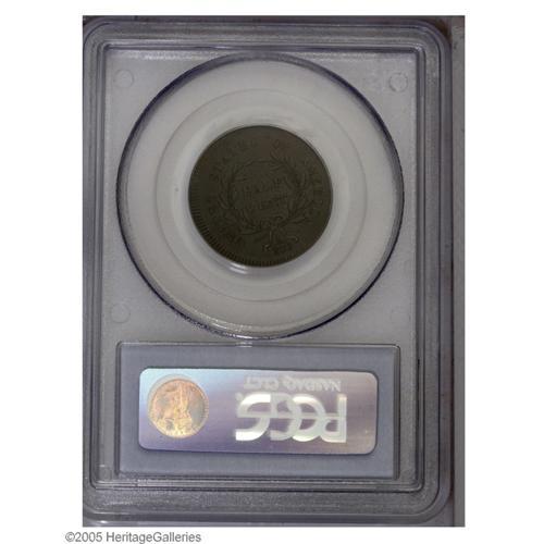 <B>1795<1/2 C> Plain Edge Fine 15 PCGS.</B></I> B-6c, C-6a, R.2. An attractively defined mahogany-brown representative. A faint pinscratch on the right obverse margin, otherwise smooth and glossy. Struck a few degrees off center toward 4:30, on a cut-down 1794 Talbot, Allum & Lee Cent. The NE in NEW from the undertype is within the obverse dentils at 7:30, and a corner of Liberty's bound goods is in the reverse dentils at 10:30.