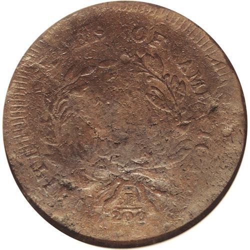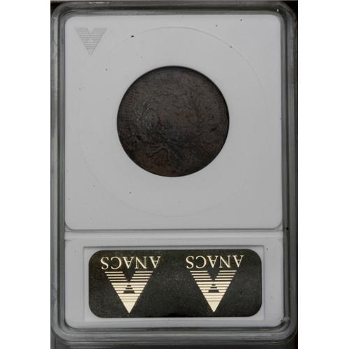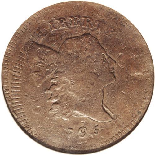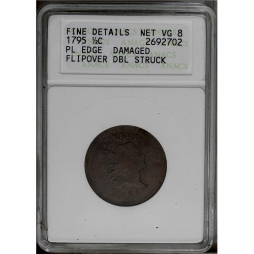 <B>1795<1/2 C> Plain Edge, Punctuated Date--Flipover Double Struck--Damaged--ANACS. Fine Details. Net VG8.</B></I> C-4, B-4, R.3. The most readily visible features of the double strike are on top of Liberty's cap on the obverse, with the letters AME clearly visible. Similarly, traces of the Liberty cap can be seen on the reverse at AME. Pleasing light to medium brown color with slight waves in the planchet. The surfaces are lightly scraped and scratched with evidence of light corrosion on the reverse. EAC 6. <BR><BR><B>Important notice:</B> Heritage usually auctions material at the rate of 200-250 lots per hour. On some occasions eBay Live bid software or the Internet may not be able to keep up with the pace of the auction. We recommend placing a realistic absentee bid now as insurance to avoid disappointment. Occasionally the auctioneer may eliminate or reject an eBay Live bid, and the auctioneer may also reopen a lot after the close of the eBay live bidding (usually because we missed an audience bid), and may reject your bid even if it shows you as the winning bidder. By bidding via eBay Live, you agree that Heritage may award the lot to another bidder at its sole discretion under the circumstances described above or any other reasonable circumstances. Since eBay bids are not shown to us until we open the lot on the floor, we treat those bids just like floor bids. In most cases the floor responds before the eBay bid is presented to us, due to Internet lag time, so for consistency we have made it a policy that floor bids are always considered first over tie eBay live bids. Also please note that all Heritage lots purchased through eBay Live carry a 20% Buyer's Premium. Please make sure you read the Terms and Conditions before you bid. This lot is being auctioned in conjunction with a live floor auction by Heritage Galleries & Auctioneers. All final auction and invoice information will be supplied by Heritage Galleries & Auctioneers, and all other information should be considered preliminary. Lot:202 <BR><BR><B>Winning Notification and Billing:</B> After the FINAL session in this auction is complete, Heritage will send e-mail and snail mail invoices. This process normally takes several days. All final auction and invoice information will be supplied by Heritage Galleries & Auctioneers, and all other information should be considered preliminary. <BR><BR>This auction will be conducted on a live auction floor and over the Internet through eBay Live. If you choose to place an absentee bid, please take a moment to <font color='#0000ff'><u><a href='http://pages.ebay.com/liveauctions/help/before/laabsentee.html'>learn how eBay Live absentee bidding works</a></u></font><font color='#000000'>