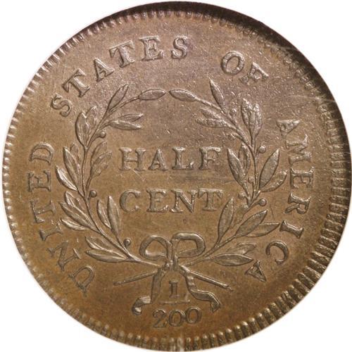 <B>1795<1/2 C> Plain Edge, No Pole MS63 Brown NGC.</B></I> C-6a, B-6a, B-6c, R.2. A remarkable light golden-brown example that has occasional hints of medium brown toning on the bust tip and on the reverse above HALF. A faint, thin gray streak from the chin to the rim serves as an identifier. Satin luster sweeps exemplary surfaces, which are essentially carbon-free. Examination locates only two unimportant post-strike marks on the center of the neck. The devices are boldly impressed, although the strike is incomplete on the right sides, which retain some minute marks present on the planchet prior to the strike. Census: 1 in 63, 1 finer (6/06). EAC 50.<BR><I>Ex: Long Beach Connoisseur Collection (Bowers and Merena, 8/99), lot 7; Haig A. Koshkarian Collection (American Numismatic Rarities, 3/04), lot 3.</B></I>