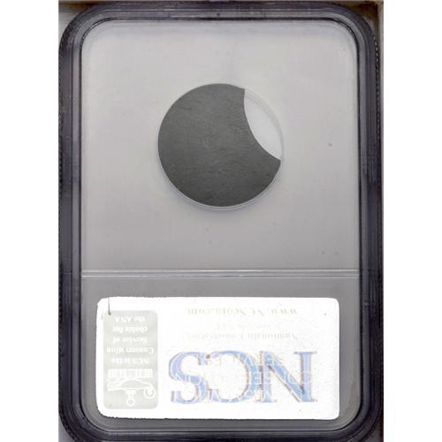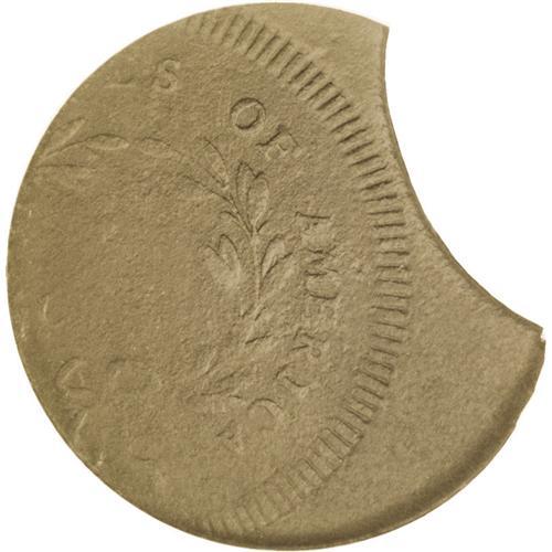 <B>1795<1/2 C> Plain Edge, Punctuated Date--30% Off-Center with 25% Curved Clip--Corroded, NCS. XF Details.</B></I> C-4, B-4, R.3. Usual die state with HALF CENT mostly illegible. This is a stunning and spectacular double error, either of which would be extremely important in its own right. The substantial curved clip is positioned at 4 o'clock. This clip is larger than any we recall seeing on a half cent of any date, let alone this 18th century date. Similarly, the off-center strike, positioned to 9 o'clock, is further off-center than we recall on any other examples. The combination is nothing short of amazing. Any combination of two or more error types on a single coin essentially makes that coin <B>unique.</B></I> It is completely unreasonable to think that another identical error combination could have been produced, unless someone at the Mint was making these intentionally, and during the 1790s, that was probably not the case.<BR> The surfaces are lightly corroded. The obverse has charcoal-brown and deep green color, with mostly deep green on the reverse. A few old obverse scratches are so nicely blended with the rest of the coin that they are not immediately obvious. EAC 12.