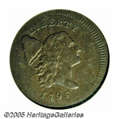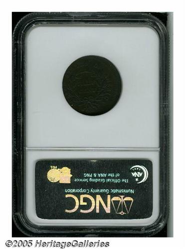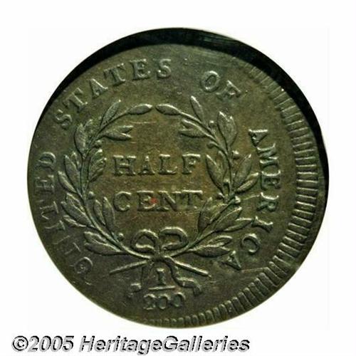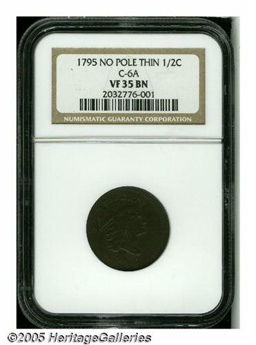 <B>1795<1/2 C> Plain Edge VF35 NGC.</B></I> B-6a, C-6a, R.2. The thin planchet subvariety; no traces of a Talbot, Allum & Lee undertype are noted. A lovely deep golden brown piece, all major device details are clear and no hint of porosity is present. A few light and relatively unimportant obverse handling marks are detected beneath a glass. Struck a bit more off center toward 9 o'clock than is usual for the variety, UNITED is quite close to the left border, although all legends are complete.