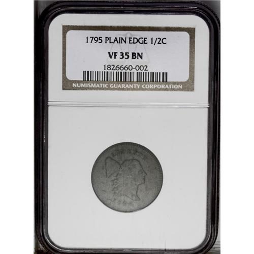 <B>1795 1/2 C Plain Edge VF35 NGC.</B></I> C-6, B-6, R.2. This is the common No Pole type, an excellent choice for date or type collectors. The pleasing golden-brown surfaces will also appeal to variety specialists. This is an attractive example with few surface marks. Traces of verdigris on the reverse can probably be removed with a little special attention. Due to the NGC holder, the weight of this piece is not known, thus the precise attribution (C-6a or C-6b; B-6a, B-6b, or B-6c) is undeterminable. EAC 12.<BR><BR><b>Shipping:</b> Coin/Currency (<a target="_blank" href="http://www.heritageauctions.com/common/shipping.php">view shipping information</a>)