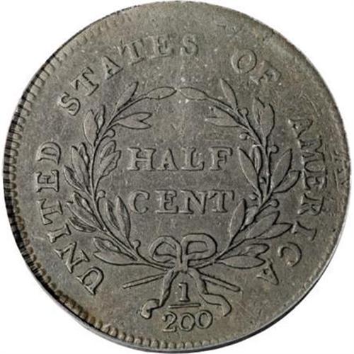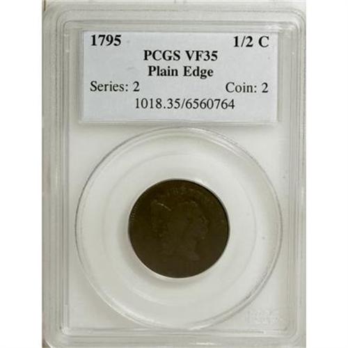 <B>1795 1/2 C Plain Edge VF35 PCGS.</B></I> C-6a, B-6c, R.2. This thin planchet subvariety is struck on a cut-down Talbot, Allum & Lee cent token. The undertype is evident between 3 and 5 o'clock on the obverse and at 3 o'clock on the reverse. A medium brown example that has a couple of small rim bruises beneath the date and faded thin marks near the mouth and right wreath stem. EAC 15.<BR><I>From The Casa Becca del Norté Collection.</B></I><BR><BR><B>Coin Engraver:</B> John Smith Gardner<BR><BR><b>Shipping:</b> Coins & Currency (<a target="_blank" href="http://www.heritageauctions.com/common/shipping.php">view shipping information</a>)
