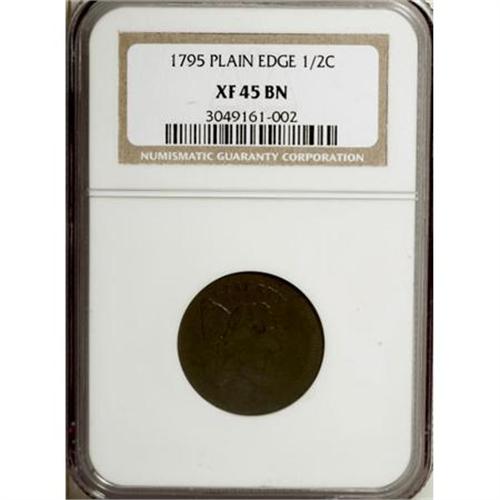 <B>1795 1/2 C Plain Edge XF45 NGC.</B></I> C-6a, B-6c, R.2. Struck on cut-down token stock; clear remnants of the undertype are visible at the right obverse and right reverse, although identification of the undertype is uncertain. Slightly off center to the left, with wide right borders, permitting additional viewing of the undertype. Deep chestnut and steel surfaces have traces of mahogany color. This lovely cent exhibits few surface marks on either side. An important opportunity for the specialist. EAC 30.<BR><BR><B>Coin Engraver:</B> John Smith Gardner<BR><BR><b>Shipping:</b> Coins & Currency (<a target="_blank" href="http://www.heritageauctions.com/common/shipping.php">view shipping information</a>)