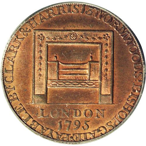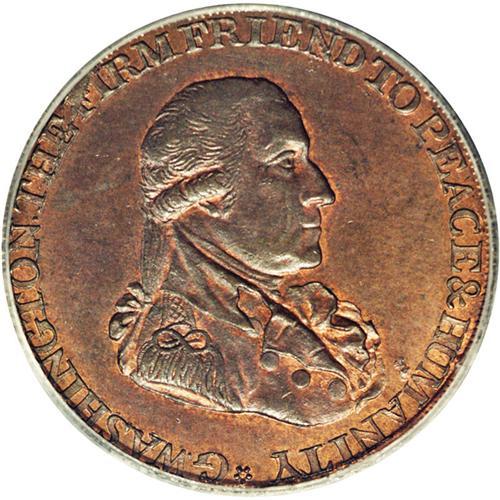 <B>1795<1/2P> Washington Grate Halfpenny, Large Buttons, Reeded Edge MS65 Red and Brown PCGS.</B></I> Baker-29AA. Glowing orange luster outlines legends and design elements. The portrait and fields are smooth medium-brown. A well preserved piece with the usual slight softness on the first ON in LONDON. This is the single finest PCGS-certified Washington Grate halfpenny. Listed on page 79 of the 2006 <I>Guide Book.</B></I>