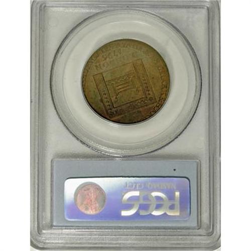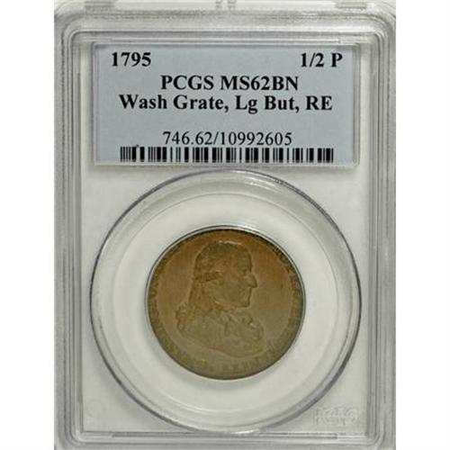 <B>1795 1/2P Washington Grate Halfpenny, Large Buttons, Reeded Edge MS62 Brown PCGS.</B></I> Baker-29AA. An unworn and attractive chocolate-brown piece that displays faint, scattered abrasions. The upper obverse and upper right reverse legends are cut off. Listed on page 79 of the 2008 <I>Guide Book</B></I>. Population: 31 in 62 Brown, 63 finer (8/07).<BR><I>From The Beau Clerc Collection.</B></I><BR><BR><b>Shipping:</b> Coins & Currency (<a target="_blank" href="http://www.heritageauctions.com/common/shipping.php">view shipping information</a>)