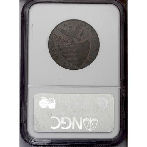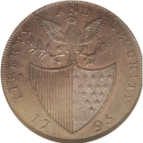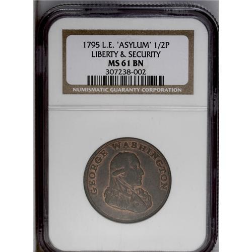 <B>1795<1/2P> Washington Liberty & Security Halfpenny, ASYLUM Edge MS61 Brown NGC.</B></I> Baker-31A. The ASYLUM edge variant of this halfpenny token is believed scarcer than the Plain Edge, LONDON Edge, and BIRMINGHAM Edge varieties. Better struck than usual for the type, which is seldom encountered with clear upper left stars, as seen on the present piece. Crimson luster outlines brown fields and devices. A few minor laminations are noted near LIBERTY. Listed on page 80 of the 2007 <I>Guide Book.</B></I>
