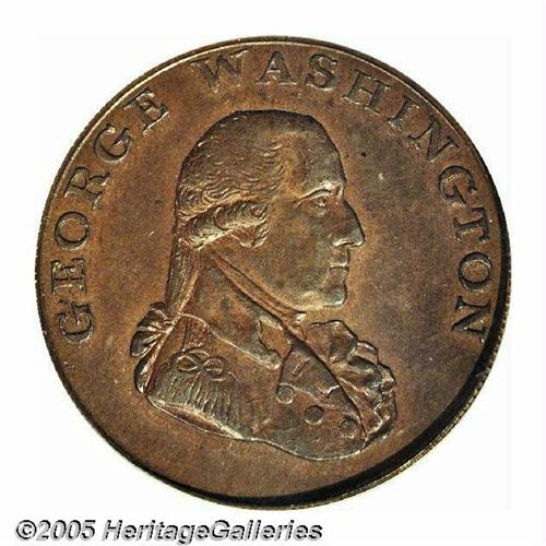 <B>1795<1/2P> Washington Liberty & Security Halfpenny, ASYLUM Edge MS64 Brown PCGS.</B></I> Baker-31A. The rarest of the Liberty and Security halfpenny varieties. "At least 15 known" according to Rulau-Fuld, which would categorize the ASYLUM variety as R.6. Variegated golden-brown and mahogany patina. Generally well preserved, moderate marks are on the forehead and lower cheek. As of (6/05), the single finest PCGS-certified ASYLUM Edge example. Listed on page 67 of the 2005 <I>Guide Book.</B></I><BR><I>From The Melrose Bay Collection.</B></I>