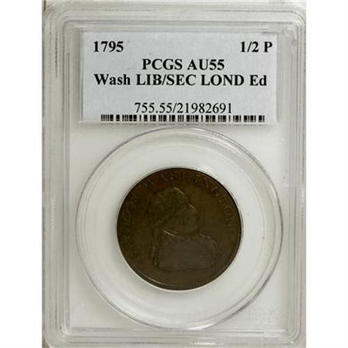 <B>1795 1/2P Washington Liberty & Security Halfpenny, LONDON Edge AU55 PCGS.</B></I> Baker-31. A dusky golden-brown Washington halfpenny with splendidly carbon-free surfaces. There are no relevant marks, and although the strike is typical, actual wear is minimal. Listed on page 80 of the 2008 <I>Guide Book</B></I>. Population: 4 in 55, 6 finer (12/07).<BR><BR><b>Shipping:</b> Coins & Currency (<a target="_blank" href="http://www.heritageauctions.com/common/shipping.php">view shipping information</a>)