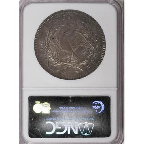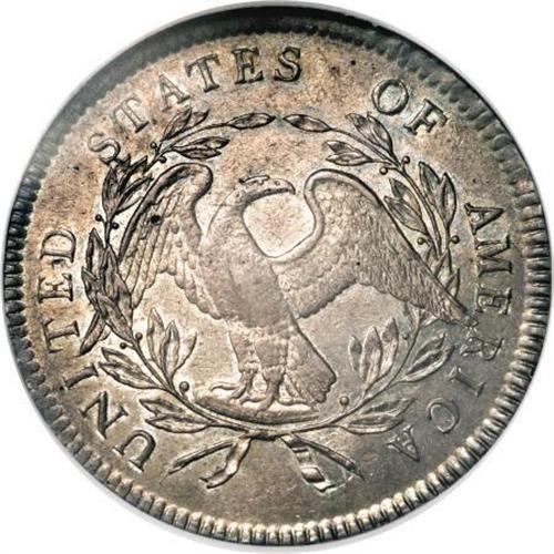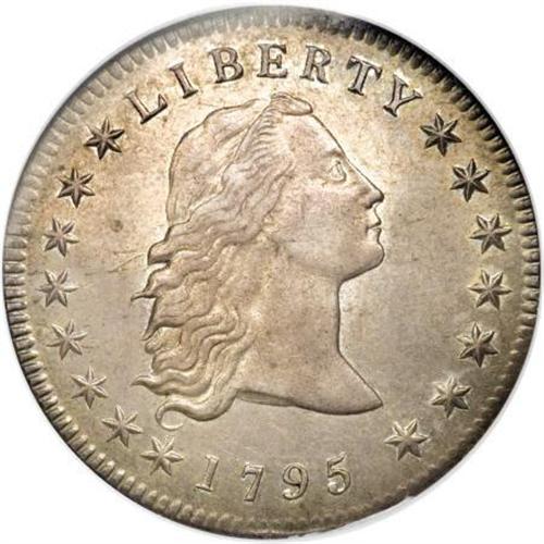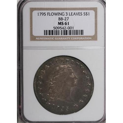 <B>1795 $1 Flowing Hair, 3 Leaves MS61 NGC.</B></I> B-5, BB-27, R.1. Die State II. The die combination is immediately recognized by a diagonal die line in the left obverse field near the upper hair curl. All die states have this short, diagnostic die scratch. Since the obverse was only used for this single variety, the die scratch is the only necessary identification trait. The early die states of B-5 are usually weak at the centers, much like this example. Later die states are more sharply struck. <BR> The number of coins that this die pair actually struck is estimated to be as high as 100,000 coins, nearly half the calendar year mintage, but probably only about one-quarter the actual mintage of 1795 silver dollars. It is probably the case that about 8,000 1795 Flowing Hair dollars still exist today, including approximately 2,000 1795 B-5 dollars, and another 1,500 B-1 dollars.<BR> Undoubtedly the most plentiful die variety of the year, yet only about a dozen B-5 silver dollars survive in Mint State grades, including this piece. Dave Bowers once estimated as many as 50 to 100 Mint State examples survive today, however, we feel that his estimate is much too liberal.<BR> An outstanding example with full underlying mint luster, the surfaces have gorgeous gold, heather, and pale blue toning, especially on the obverse. The strike is well centered with bold obverse and reverse borders. Both sides have the usual scattered surface marks that undoubtedly limited the grade of this piece, yet there are no unusual individual marks.<BR><I>From The Queller Family Collection of Silver Dollars.</B></I><BR><BR><b>Shipping:</b> Coins & Currency (<a target="_blank" href="http://www.heritageauctions.com/common/shipping.php">view shipping information</a>)