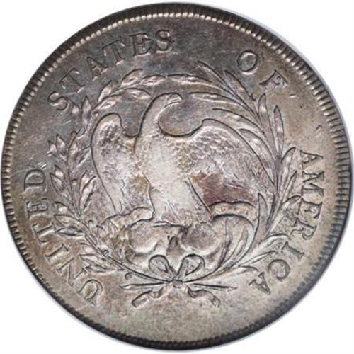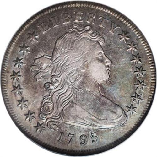 <B>1795 $1 Draped Bust, Centered AU50 NGC.</B></I> B-15, BB-52, R.2. Bowers-Borckardt Die State IV, noted for its "jagged, vertically oriented lump" within Liberty's hair near the ribbon. B-14 and B-15 are the only two 1795 Draped Bust die varieties, and are historically significant as the first dies of the design type, which dominated the silver and copper denominations until John Reich's 1807 arrival. B-14 and B-15 receive separate entries in the <I>Guide Book </B></I>because the obverse device punch for the B-14 was entered too far to the left. The Bust device was correctly centered for B-15, the scarcer of the two marriages.<BR> This partly lustrous example has medium golden-brown and aqua toning. The eagle retains some breast feathers, and the stars have distinctive centers. The obverse has a couple of insignificant adjustment marks, as made, and moderate marks are noted on the back of the neck and above the D in UNITED.<BR><BR><b>Shipping:</b> Coins & Currency (<a target="_blank" href="http://www.heritageauctions.com/common/shipping.php">view shipping information</a>)