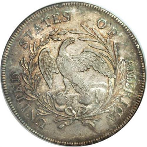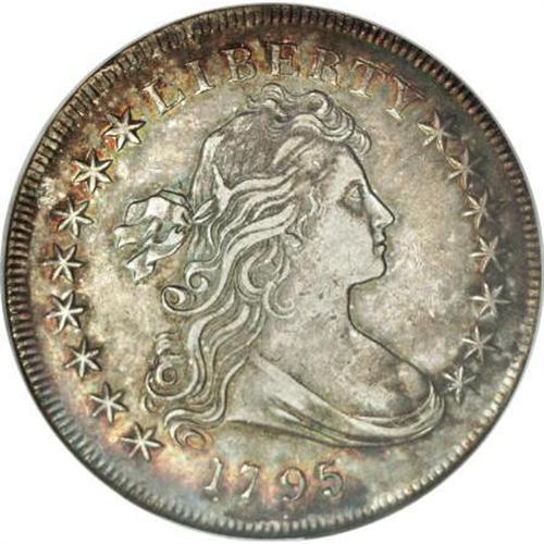 <B>1795 $1 Draped Bust, Centered AU53 NGC.</B></I> B-15, BB-52, R.2. The Centered Bust variety with stars 1 and 2 separated from the hair curls, and star 15 lightly joining the drapery. The other known variety, B-14, is called the "Uncentered Bust" and has stars 1 and 2 solidly joined to the curls, but star 15 separated from the drapery.<BR> Medium gray surfaces on both sides are accompanied by splashes of lighter silver color, and rainbow toning. The obverse has peripheral gold, russet, sea-green, and steel; the reverse has pale gold and iridescence. Census: 15 in 53, 70 finer (1/08).<BR><BR><B>Coin Engraver:</B> Robert Scot<BR><BR><b>Shipping:</b> Coins & Currency (<a target="_blank" href="http://www.heritageauctions.com/common/shipping.php">view shipping information</a>)