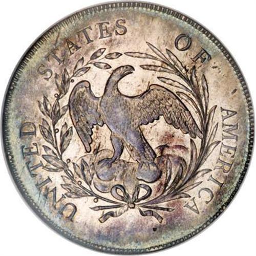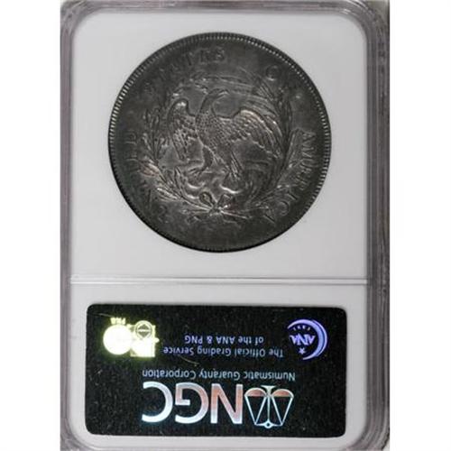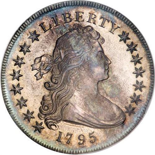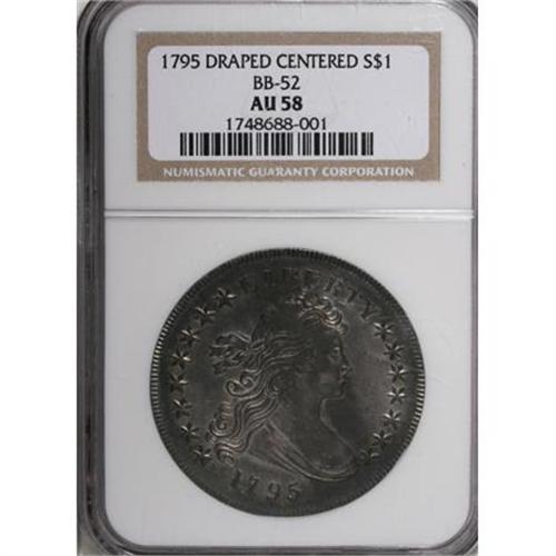 <B>1795 $1 Draped Bust, Centered AU58 NGC.</B></I> B-15, BB-52, R.2. Die State V. A faint hairline crack is evident over the R, continuing to the tops of ICA as described in the Superior Gilhousen Catalog (October 1973), there described as one of the last pieces made. The Queller specimen is in a similar late die state, and is a finer example, approaching the Mint State category.<BR> A trace of wear on Liberty's cheek and shoulder, and rub on the eagle's body, are the only traits that prevent a Mint State grade for this lovely piece. Reflective silver surfaces are enhanced by steel and iridescent toning. Perhaps 10 or 12 Mint State coins exist, followed by this piece and a few other exceptional AU coins. In their 1991 catalog, Stack's called this piece Brilliant Uncirculated.<BR><I>Ex: Stack's (10/1991), lot 837.</B></I><BR><I>From The Queller Family Collection of Silver Dollars.</B></I><BR><BR><b>Shipping:</b> Coins & Currency (<a target="_blank" href="http://www.heritageauctions.com/common/shipping.php">view shipping information</a>)