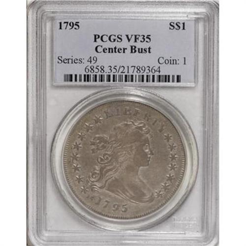 <B>1795 $1 Draped Bust, Centered VF35 PCGS.</B></I> B-15, BB-52, R.2. Die State IV in the Bowers-Borckardt treatise on the subject. Beige coloration adorns the smooth, attractive surfaces of this example. Slight rotation under a light source reveals a pleasing light gold tone. There are two varieties of 1795 Draped Bust dollars, both with Small Eagle reverses, and easily distinguishable by the left-to-right positioning of Liberty's figure. This variety has the bust properly centered on the die.<BR><BR><B>Coin Engraver:</B> Robert Scot<BR><BR><b>Shipping:</b> Coins & Currency (<a target="_blank" href="http://www.heritageauctions.com/common/shipping.php">view shipping information</a>)