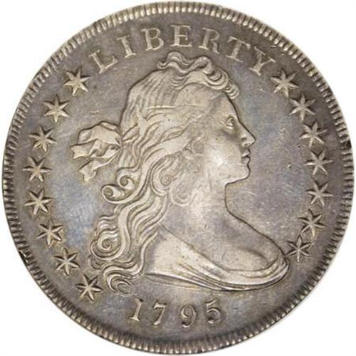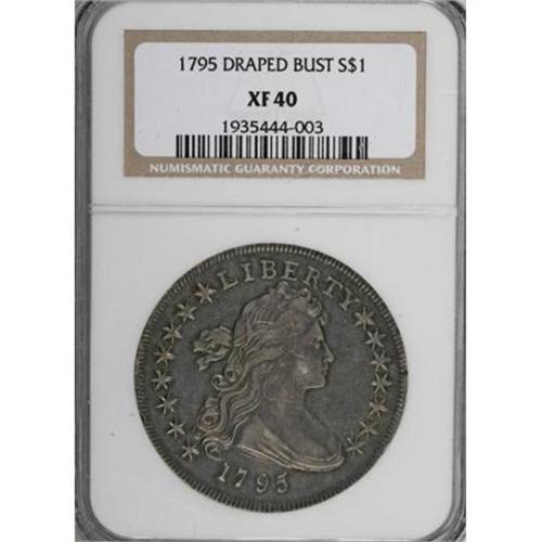 <B>1795 $1 Draped Bust, Centered XF40 NGC.</B></I> B-15, BB-52, R.2. Bowers-Borckardt Die State IV. This charming first-year Draped Bust dollar has dove-gray toning that deepens near the borders. Minor to moderate marks include a curved line on the reverse exergue. The portrait has a few faint adjustment marks, as made.<I><BR>From The Beau Clerc Collection.</B></I><BR><BR><B>Coin Engraver:</B> Robert Scot<BR><BR><b>Shipping:</b> Coins & Currency (<a target="_blank" href="http://www.heritageauctions.com/common/shipping.php">view shipping information</a>)