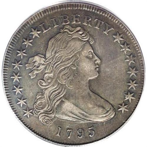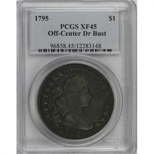 <B>1795 $1 Draped Bust, Off Center XF45 PCGS.</B></I> B-14, BB-51, R.2. When the 1795 Flowing Hair obverse die was retired in favor of the Draped Bust obverse--still mated with the Small Eagle reverse--the first silver dollar die created had the effigy of Liberty engraved quite too far left, uncentered in the die. The obverse error was corrected on subsequent matings with the reverse, which was eventually paired with a total of six different varieties dated in four different years. <BR> This lovely Choice XF piece displays deep grayish-gold color with a tinge of blue patina, beneath which some luster remains. Neither side reveals any noticeable distractions, even under a loupe. A nice type coin.<BR><BR><B>Coin Engraver:</B> Robert Scot<BR><BR><b>Shipping:</b> Coins & Currency (<a target="_blank" href="http://www.heritageauctions.com/common/shipping.php">view shipping information</a>)