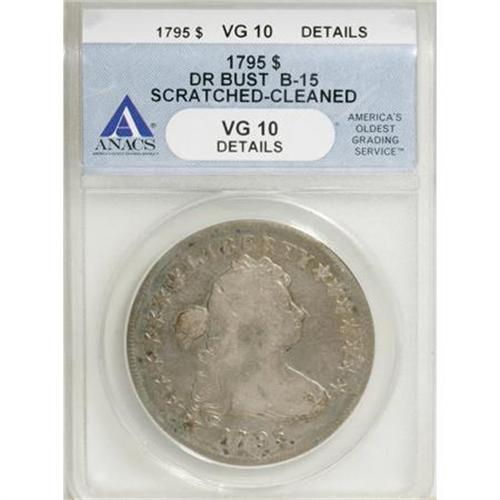 <B>1795 $1 Draped Bust, Centered--Scratched, Cleaned--ANACS. VG10 Details.</B></I> B-15, BB-52, R.2. This example has bold legends, and the lower tresses of Liberty's hair have some definition. Delicate aqua and ice-blue toning drapes the subdued surfaces. The cheek and neck have a few slide marks, and a small abrasion is present near the nose, but the eye appeal is pleasing given its grade and affordability.<BR><I>From The John Stimson, Sr. Collection, Part Two.</B></I><BR><BR><B>Coin Engraver:</B> Robert Scot<BR><BR><b>Shipping:</b> Coins & Currency (<a target="_blank" href="http://www.heritageauctions.com/common/shipping.php">view shipping information</a>)