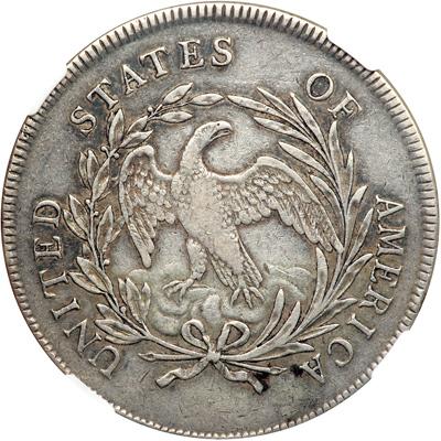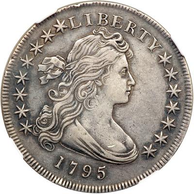 1795 $1 B-14, BB-51 Rarity 2 Off-Centered. NGC graded EF-45. Pop 11; 20 finer for the variety. We note a couple minor obverse rim marks, but all in all this is an attractive coin. The eagle's wings and breast show nice detail. Having struck the flowing hair style in 1794 and for most of 1795, the Mint switched gears by presenting commerce with the attractive new draped bust, small eagle style late in 1795. Two varieties are known. This has the bust to the left of center.