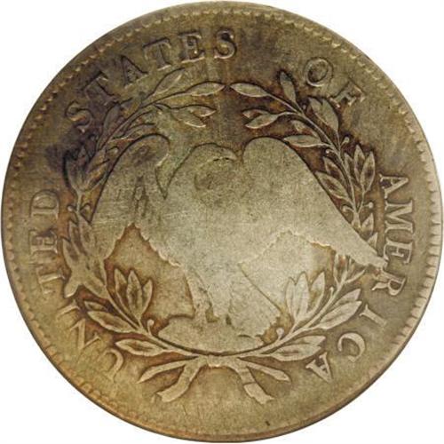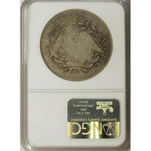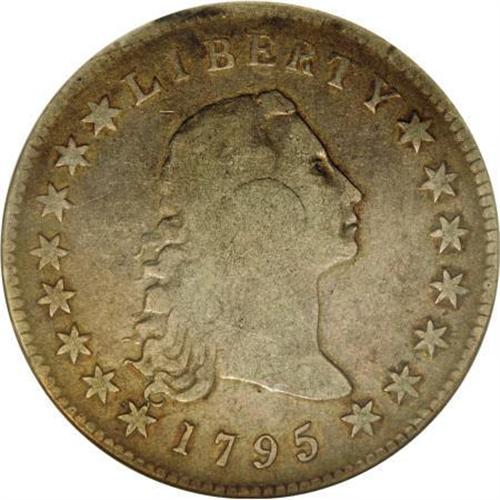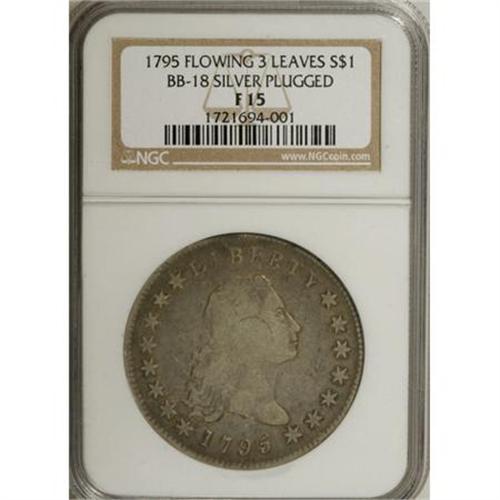1795 $1 Flowing Hair,3 Leaves Silver Plug Fine 15 NGC. B-7, BB-18, R.3. The outline of the slightly oval-shaped plug is faintly visible at the center of the obverse. This mint-made plug was inserted to bring the piece up to weight specifications, and was briefly mint procedure instead of simply melting the flan and starting again. The dove-gray surfaces are refreshingly unabraded, and protected areas display glimpses of orange toning. A few inconsequential adjustment marks (as produced) are confined to the reverse margin. Our auction records over the past few years confirm that B-1 and B-7 are the usual silver plug varieties, although B-3, B-4, and B-5 have also appeared with mint-issued silver plugs.<BR><BR><B>Coin Engraver:</B> Robert Scot<BR><BR><b>Shipping:</b> Coins & Currency (<a target="_blank" href="http://www.heritageauctions.com/common/shipping.php">view shipping information</a>)