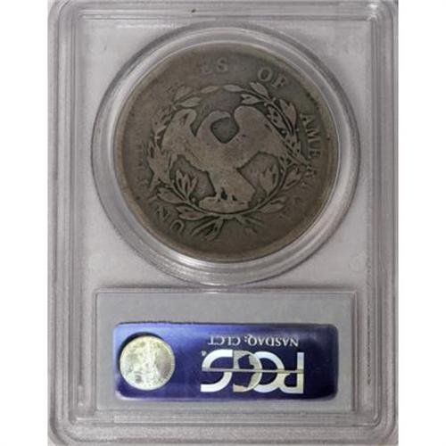 <B>1795 $1 Flowing Hair, Three Leaves AG3 PCGS.</B></I> B-5, BB-27, R.1. Attributed by a three leaves under each wing, and seven berries on the left branch and six on the right. This heavily worn light gray piece has surprisingly clean surfaces, and most of the design elements outlined.<BR><I>From The John Stimson, Sr. Collection, Part Two.</B></I><BR><BR><B>Coin Engraver:</B> Robert Scot<BR><BR><b>Shipping:</b> Coins & Currency (<a target="_blank" href="http://www.heritageauctions.com/common/shipping.php">view shipping information</a>)