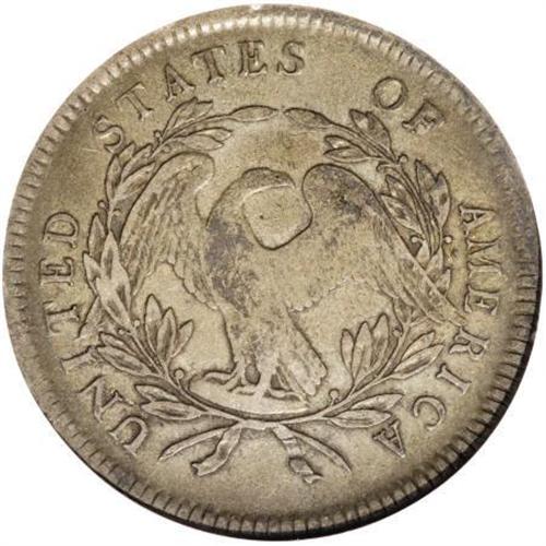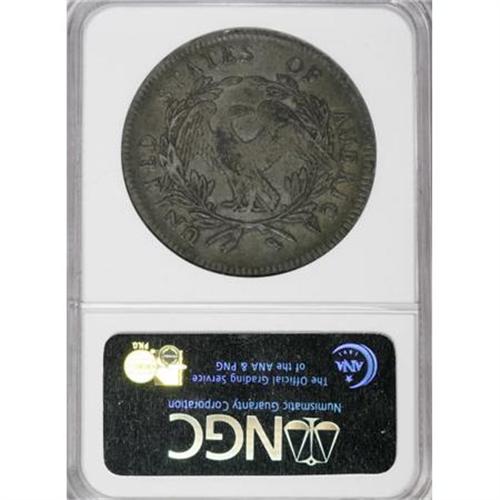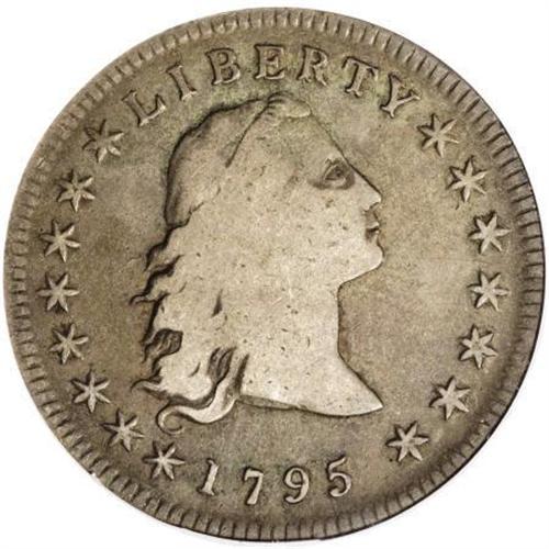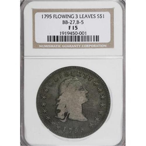 <B>1795 $1 Flowing Hair, Three Leaves Fine 15 NGC.</B></I> B-5, BB-27, R.1. The diagnostic diagonal bar in the upper left obverse field, adjacent to the upper hair curl, is visible on this example, as it is on nearly every known survivor. A reverse die crack from the border to the left stem is faintly visible. This piece is deeply toned with lighter gray on the obverse motif, an attractive two-tone example.<BR><BR><B>Coin Engraver:</B> Robert Scot<BR><BR><b>Shipping:</b> Coins & Currency (<a target="_blank" href="http://www.heritageauctions.com/common/shipping.php">view shipping information</a>)