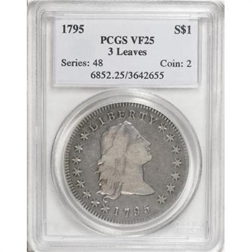 <B>1795 $1 Flowing Hair, Three Leaves VF25 PCGS.</B></I> B-5, BB-27, R.1. The pearl-gray devices are encompassed by light autumn-brown fields. No adjustment marks are visible, and abrasions are generally minor for the grade. The eagle's left wing displays considerable plumage detail. A worthy Flowing Hair type coin.<BR><BR><B>Coin Engraver:</B> Robert Scot<BR><BR><b>Shipping:</b> Coins & Currency (<a target="_blank" href="http://www.heritageauctions.com/common/shipping.php">view shipping information</a>)