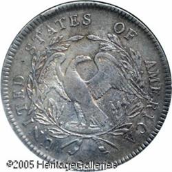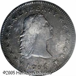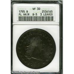 <B>1795<img border='0' src='http://www.heritagecoins.com/images/star.gif' width=10 height=10>$1 Flowing Hair, Three Leaves VF30 ANACS.</B></I> B-5, BB-27, R.1. Specialists of early Silver Dollars know to look for the 'bar' behind the highest trailing hair curl to identify this more available Bolender variety. Deep golden-brown and forest-green colors bathe this attractively defined example. Handling marks are surprisingly absent, except for a couple of minor rim marks on each side. One of the toughest silver types, yet collectible at the Choice VF level. Lot:7304